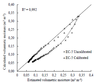 As can be seen, soil moisture can be estimated with reliability after the specific calibration of the EC-5 sensor since it had a fairly high coefficient of determination, corresponding to 0.99.