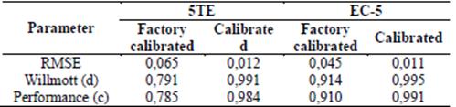 The RMSE values for the 5TE sensor before and after calibration varied from 0.065 to 0.012 m3 m-3, respectively, as occurred with the EC-5 sensor, which had a low RMSE value (0.011), showing that these types of sensor promoted better estimation of volumetric soil moisture after being calibrated.