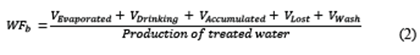 The WFb is subdivided into the following: the volumes evaporated, produced, accumulated, lost by fissures, and used in washing water (Eq. 2). The volume of evaporated water (VEvaporated) is estimated as the product of the multi-year monthly mean evaporation of the selected month according to climatic condition under study and the water mirror area. The volume of water produced (VDrinking) was obtained from the macro measurement records of the MSF systems. The volume of accumulated water (VAccumulated) was estimated using the geometry of the ponds measured in the field. In the units without filters, the wet depth of the structure was measured; in the filters, the total wet depth was estimated as the sum of the depth measured from the top of the filter bed to the surface of the water and the depth of the bed according to the designs; knowing the theoretical porosity at which this type of filter is built, the volume of accumulated water was estimated as the difference between the total wet volume of the filter and the volume occupied by the filter bed. The volume of water lost due to fissures (VLost) in different parts of the filters was calibrated in the wash water outlet chambers of the two study cases. The volume of water used in the washings (VWash) was estimated as the product of the flow used to wash each unit of treatment or each m3 of sand in the case of SSF multiplied by the lasting of the washing work and the number of times this work is done every month, whether it is high or low precipitation.