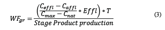 Water quality monitoring was conducted in July with the lowest precipitation and in May with the highest precipitation, taking samples of i) the water used for washing, ii) the water effluent from washing of each of treatment units of MSF systems (dumping) and iii) the source of the discharges. In the samples taken, quality parameters that have already established quality objectives were analyzed in the laboratory. WFgr were estimated for each of the quality parameters analysed, and only the greater quantity of each treatment unit was selected. Finally, total water footprint is the sum of total green, blue, and WFgr.