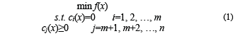 where f(x) is objective function, ci(x) is equality constraint condition, cj(x) is inequality constraint condition, x is design variable, f(x), ci(x) and cj(x) are two order continuous differentiable functions defined in space Rn .