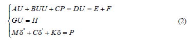 where Ae is the mass matrix, Be is the convective matrix, Ce is the pressure matrix, De is the loss matrix, Ee and Fe are volume force matrices, Ge is the continuous matrix, He is the boundary velocity vector, (″, (′, and ( are the acceleration, velocity, and structure stress column vector, respectively, M is the mass matrix, K is the stiffness matrix, and C is the damping matrix.