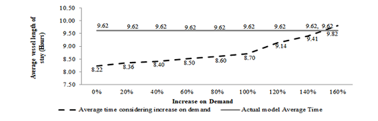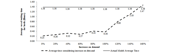 Fig. 4 presents the average vessel waiting time for berth at increasing the demand. It shows that this indicator kept below the current model time, which is 1.38 hours, up to the point where the demand increases 160% more. Therefore, adding a second berth for containerized vessels will help reduce vessels waiting time for up to 140% increase in demand.