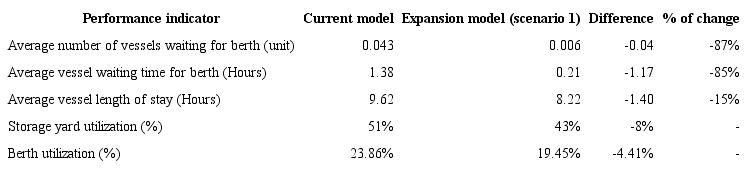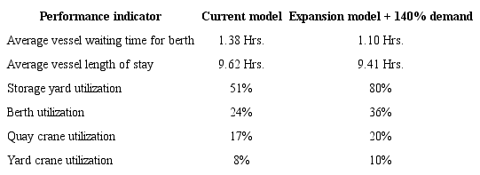 After analyzing the effect of the demand, and considering up to an 80% use of resources, the expansion plan could support up to 140% increase on demand. In summary, Table 5 presents the performance indicators values of the current model and the expansion model with 140% more demand. The average vessel waiting time for berth and the vessel length of stay show a reduction even with the increment on demand. On the other hand, the utilization of all the resources is increased, but still the level is 80% or less. The critical resource is the storage yard space.