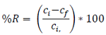 Para la cuantificación de las diversas variables de respuesta, se estimó el porcentaje de remoción (%R) utilizado como criterio de desempeño del proceso por diversos autores [17,20]. Este valor fue determinado de acuerdo a la siguiente expresión: Donde ci es la concentración del soluto inicial y cf es la concentración del soluto al final del volumen de alimentación