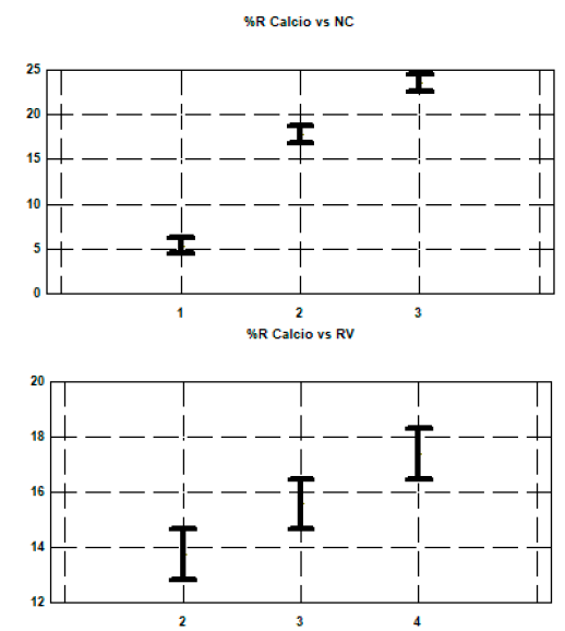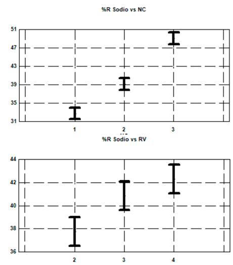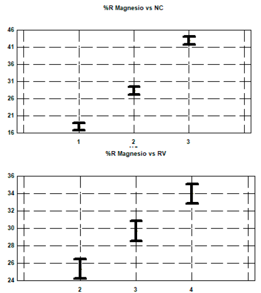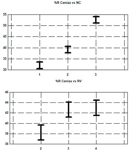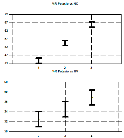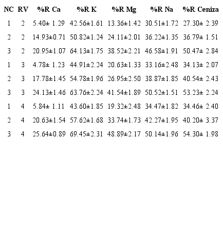 La Tabla 2 presenta los valores medios obtenidos y sus desviaciones estándar (SD) de los minerales evaluados en función de la variable %R. Se observa, un grado de desmineralización obtenido de las variables en general, donde el potasio y cenizas, fueron eficientes al obtener %R de mayor valor, a diferencia del calcio el cual se obtuvo un máximo del 25%. Cabe resaltar, una tendencia al aumento del %R a medida que se utilizó un factor de dilución mayor. Con respecto a la variable calcio, el ANAVA no presentó diferencias significativas por efecto de la interacción doble (P>0.05) en función de los parámetros NC y RV. Sin embargo, existe efecto estadísticamente significativo (P<0.05) para los efectos separados, principalmente en la variable NC (Fig. 1).