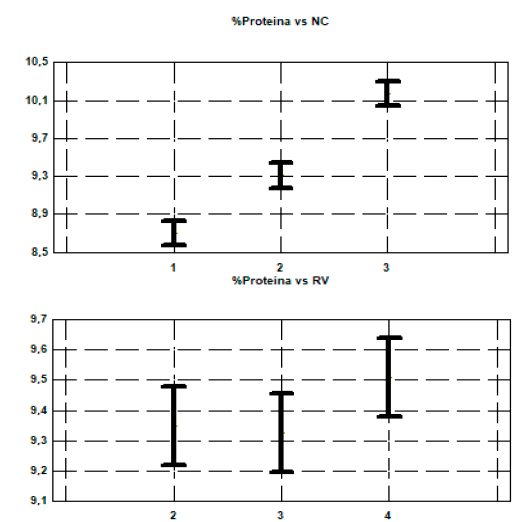 En términos generales, la variable NC aumenta gradualmente, mientras que RV fue aleatoria independientemente del grado de dilución utilizado, al igual que con la variable proteína. De manera que a medida que se aumente los NC, se puede esperar una mayor dilución