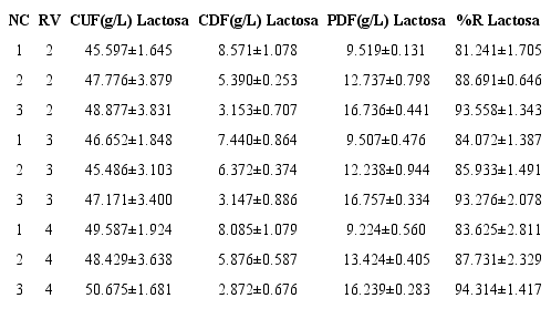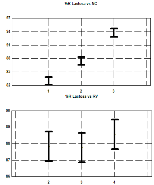 De los resultados anteriores, se define la variable Lactosa, como el compuesto que más se afecta durante la concentración de proteínas por medio de la DF y se considera muy efectivo. El ANAVA al 5% mostró que el %R para este componente no es estadísticamente significativo para la interacción de RV y NC (P>0.05). Sin embargo, para el efecto individual de la variable NC, sí existe diferencia estadística (P<0.05) como se describe en la Fig. 7.
