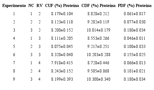 Inicialmente, las concentraciones obtenidas en el CUF son similares como se esperaba puesto que las muestras del concentrado se trataron de igual forma, la diferencia radica en la calidad del suero utilizado y esta depende tanto de la calidad de la leche como del proceso al cual se sometió la materia prima [28]. Así mismo, los valores obtenidos con respecto al CDF mayores, corresponden a las muestras que se asocian un mayor número de ciclos, específicamente los experimentos 3, 6 y 9.