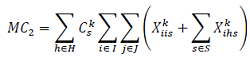 Para los volúmenes diarios del producto k que son transportados de un cliente i a uno j, se debe considerar su paso por los centros satélite y el o los centros logísticos principales que se requiera, para lo cual se utiliza la siguiente notación: Xiisk;Xishk ; Xihsk;Xihh´k;Xih´jk (Lo anterior implica un tránsito por los nodos i-s; s-h; h-h’; h’-s´; s´-j. Igualmente, se consideran los costos asociados a los viajes como Cvisk; Cvshk; Cvhhk¨; Cvh´jk. El costo marginal de cada satélite y de los centros logísticos son Csk y Chk. También se debe considerar el costo fijo en los centros logísticos principales únicamente, es decir Ch. El resto de la nomenclatura para el modelo se describe a continuación: