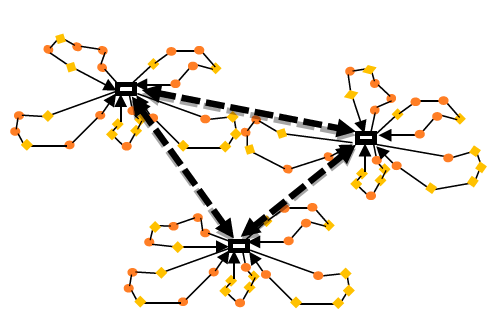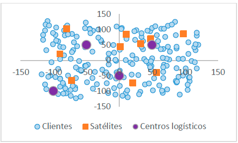 La representación gráfica de la red descrita es similar a la presentada en la Fig. 3. donde se tienen unos clientes finales que pueden tanto enviar como recibir mercancía y que deben ser asignados a un satélite; posteriormente cada satélite debe ser asignado a un hub; en este caso se considera la distancia lineal entre los nodos como criterio de decisión para estas asignaciones.