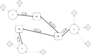 Para simplificar la nomenclatura de las rutas que se generan en cada etapa, los satélites asociados al cliente final se definen como el conjunto s´; los centros logísticos asociados al satélite final h’ y si hubiese un centro logístico intermedio como h´; la unión entre estos nodos se denota con un guion; es decir, (h´-s´-j) denota que se genera una ruta entre el centro logístico final h´y el satélite asociado s´para atender al cliente de entrega j.