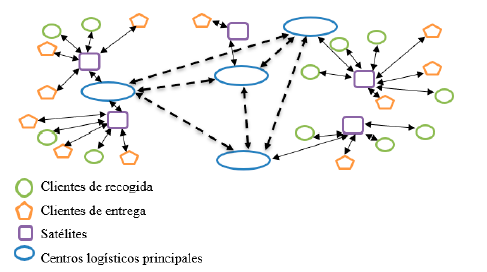 De acuerdo con lo expresado anteriormente, dadas las condiciones de transporte de mensajería y paquetería, es necesario caracterizar la red como un PDNDP (Parcel delivery Network Design Problem). En el caso de Colombia, país objeto de estudio de este trabajo, cada ciudad tiene un centro logístico principal que funciona como un hub que desconsolida y consolida envíos hacia centros logísticos principales de otras ciudades; a estos centros logísticos llegan camiones que han recorrido centros de menor tamaño en los barrios o comunidades de cada ciudad que funcionan como centros satélites, dónde la mercancía se consolida previamente y después es enviada a los hub principales de cada ciudad.