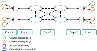 El proceso para el diseño de una red de servicios para empresas de mensajería y paquetería se puede describir en 3 etapas (Asignación y transporte de clientes a hub; Asignación de satélites a hub principales; asignación y transporte entre hub principales) tal y como se muestra en la Fig. 4. Estas etapas tienen diferentes costos asociados y las decisiones se centran en la asignación de nodos y los envíos que se realizan entre los diferentes niveles de la red de distribución.