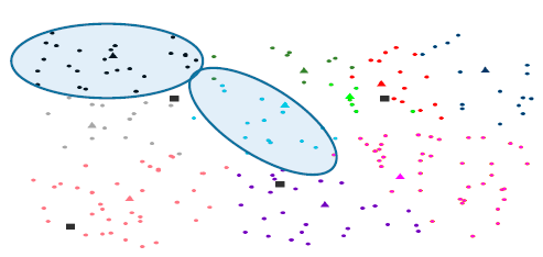 El modelo se aplicó para el análisis de un proceso de distribución de mensajería y paquetería compuesto por 10 satélites, 4 centros logísticos principales y 200 clientes de recogida y entrega, que en total suman 100 envíos diarios, tal y como se muestra en la Fig. 5. Para su validación se simularon tres escenarios de operación: el primero contempla un diseño de red tradicional, el segundo incluye la posibilidad de incorporar un factor de sobrecarga y el tercero permite la asignación entre centros logísticos que incorpora el concepto de p-mediana para el uso de centros logísticos intermedios, correspondiente al modelo propuesto en el apartado anterior. La simulación se realiza para cada una de las etapas del modelo propuesto. De esta forma en la primera etapa los clientes son asignados en función de su distancia euclidiana a los satélites y bajo el mismo criterio se asignan los satélites a los centros logísticos principales. La Fig. 6 esquematiza como se realiza la asignación obtenida, en donde un mismo color representa los clientes (puntos) que debe ser atendidos por el satélite correspondiente (triangulo).