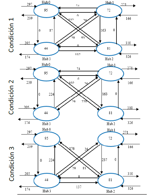 Escenario 3: Es la estrategia que contempla la totalidad del modelo propuesto e incorpora el concepto de p-mediana, donde se asigna uno o varios centros logísticos primarios en función de su tamaño (demanda que procesa), resultando la eliminación de una o más rutas entre los hub con el fin de aprovechar economías de escala. Para esto, debido a que en la etapa 3 la demanda que ingresa a cada centro y que debe distribuirse a los demás es conocida, permite identificar el o los centros logísticos primarios y asignar la demanda a los vehículos que irán a cada centro logístico principal. Si no se completa la capacidad de vehículo de un hub al otro, este será enviado al centro logístico primario, siempre que éste último tenga envíos para el hub final