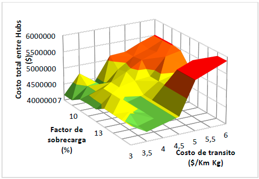 Para evaluar la robustez del modelo, se realiza una variación en los parámetros de costo de tránsito y de factor de carga para identificar el impacto que estas variaciones tienen sobre el costo entre centros logísticos, para de esta forma determinar si la respuesta del modelo es lógica ante dichas variaciones. En la Fig. 8 se presenta el comportamiento del modelo con respecto a las variaciones mencionadas, de donde se puede resaltar como regla general, al incrementar los costos de transporte los costos totales se incrementan. Además, se puede observar que en el centro de la gráfica existe un valle que atraviesa trasversalmente en un factor de sobrecarga de aproximadamente el 11%, esto indica que independientemente del costo de tránsito, el costo entre centros logísticos tiende a minimizarse para factores de sobrecarga de 11% a 12%; mientras que para valores entre 7% y 9% o de 13% y 15%, el costo total obtenido entre centros logísticos es altamente sensible a variaciones en el costo de tránsito.