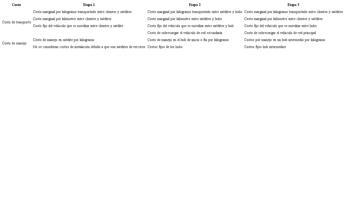 En la Tabla 1 se presentan los costos que se asocian a cada etapa y que se considerarán dentro del modelo. Como ya se mencionó, los problemas PDNDP consideran dos tipos de costos: Costos de transporte y costos de manejo; sin embargo, cada uno de estos costos se asocia con variables que afectan la estimación de dicho costo según las características de las redes de transporte propuestas en [21].