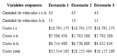 En general, de la simulación realizada es posible afirmar que el escenario de solución 3 que se propone, el cual corresponde enteramente al modelo propuesto, permite mejorar el desempeño de los costos de distribución, debido a las reducciones en el número de vehículos usados, los costos de operación y la utilización de los arcos entre centros logísticos.