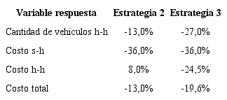 Dado que los escenarios no generan impacto en la etapa I de asignación de clientes a satélites, el número de vehículos no varía. Sin embargo, los vehículos que transitan entre centros logísticos principales disminuyen en los escenarios 2 y 3. De forma análoga, los costos entre clientes y satélites no se reducen ya que los vehículos y la carga transportada en cada uno de ellos no varía; sin embargo, el costo de transito de los satélites a los centros logísticos se reduce significativamente, ya que se está haciendo uso del factor de sobrecarga, lo que aumenta la utilización de vehículos y disminuye los costos fijos asociados a los mismos. En cuanto al costo entre centros logísticos, en el escenario 2 se aumenta levemente, lo que puede deberse a la conexión entre la totalidad de los centros logísticos, puesto que impide el aprovechamiento de las economías de escala que se ve reflejado en la disminución del mismo costo en la estrategia 3. Los cambios porcentuales obtenidos en la función de costos para los escenarios 2 y 3 en comparación con el escenario 1 se presentan en la Tabla 3.