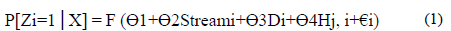 The dependent variable Z is the dichotomy index that takes a value of 1 if subject i reported illicit downloading of movie and 0 otherwise. P is the probability or likelihood that Zi equals 1. X represents the explanatory factors, including Streaming, which takes a value of 1 if any movie streaming service was used in the past 30 days and otherwise 0. D is a vector of demographic variables, and Hj, i represents factor j from the list of 10 explanatory statements for piracy. For example, if the respondent i marked item H1, then H1, i takes a value of 1 (see Appendix B for details on the rest of statements or arguments.).