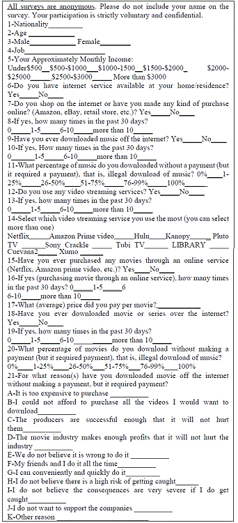 The questionnaire includes 21 questions, containing measures of demographic variables, for instance, age, gender, profession, and monthly income. Eight questions were conducted according to online activities, such as downloading movies and music, shopping, music, and movie streaming. Illegal downloading of music and movies was requested by four questions, which were designed by a set of 10 independent variables to be selected as personal treatments. Appendix A shows the survey instrument.