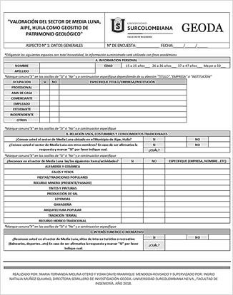 Abstract: The Geological and Paleontological Heritage is constituted by goods common to all citizens; these goods are part of the natural wealth of the nation and are transcendental in many cases for the definition and understanding of the history and dynamics of planet Earth. The selection of the Places of Geological Interest - LIGs (Geotopos and Geosites), for each category; scientific, didactic and tourist-symbolic, is done by scoring each of the parameters according to different scoring scales, according to the methodological proposal made by the Colombian Geological Service (SGC). The Media Luna sector (ML), located in the Municipality of Aipe - Huila, has geological characteristics that make it representative to recognize geological processes that have occurred in this region of the country; its assessment will allow to define if this place can be proposed as geological Heritage and additionally, integrate the values within the framework for Geoparks proposed by UNESCO.