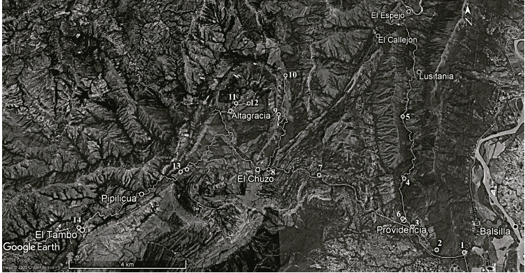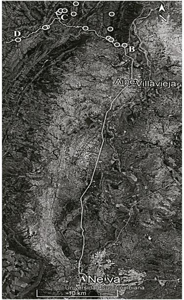 El acceso a los puntos de interés se encuentra aproximadamente a 42 km al norte de la ciudad de Neiva, en tránsito por la Ruta Nacional 45 hasta el desvío hacia la carretera de Planadas (ver Fig. 3).