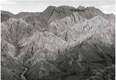 El sitio de interés, además, engloba dentro del recorrido realizado, puntos de observación en los cuales es posible apreciar la majestuosidad del relieve y de la geología estructural, siendo relevantes el sinclinal de Media Luna, el anticlinal “El Viso” (ver Fig. 7), “Falla Chusma” (ver Fig. 8) y “Flatiron” (ver Fig. 9).