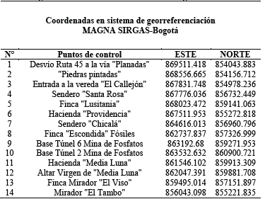 Los datos necesarios para la realización de la valoración de la zona de Media Luna como geositio de patrimonio geológico, fueron recolectados a lo largo de las salidas de campo estipuladas en el cronograma de trabajo, de esta manera durante el recorrido se tomaron un total de catorce (14) puntos de control con sus respectivos nombres y coordenadas en sistema decimal que posteriormente fueron transformadas a sistema de georreferenciación MAGNA SIRGAS-Bogotá (ver Tabla 1).