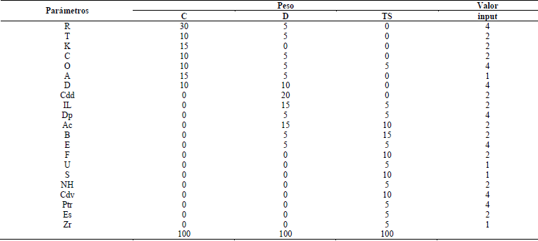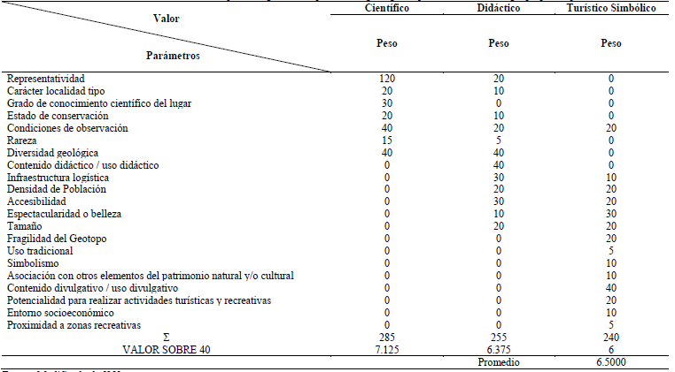 Los parámetros calificados fueron: Representatividad (R), Carácter de localidad tipo (T), Grado de conocimiento científico del lugar (K), Estado de conservación (C), Condiciones de observación (O), Rareza (A), Diversidad geológica (D), Contenido didáctico/uso didáctico (Cdd), Infraestructura logística (IL), Densidad de población (Dp), Accesibilidad (Ac), Espectacularidad o belleza (B), Tamaño del Geotopo (E), Fragilidad del Geotopo (F), Uso tradicional (U), Simbolismo (S), Asociación con otros elementos del patrimonio natural y/o cultural (NH), Contenido divulgativo/uso divulgativo (Cdv), Potencialidad para realizar actividades turísticas y recreativas (Ptr) , Entorno socioeconómico (Es) y Proximidad a zonas recreativas (Zr). Siendo 0 el valor más bajo y de menor valoración y 4 como el de mejor caracterización.