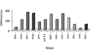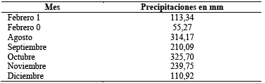 Las precipitaciones en milímetros durante un año (Fig. 1), en el año de estudio se observó que los meses más lluviosos fueron abril, mayo, agosto, octubre y noviembre, con valores promedios de entre 240 y 370 mm de lluvia. Mientras que, durante los meses de febrero (inicio y final del estudio), se observó una menor precipitación con valores de 50 a 150 mm por mes (ver Tabla No. 1)