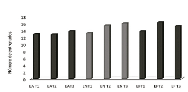 Los desarrollos de los entrenudos de los árboles de café fueron mayores durante los meses de noviembre y febrero, después de tres y seis meses respectivamente de las aplicaciones. Además, se observó que el desarrollo de los entrenudos fue mayor en las plantas sometidas al Tratamiento 3 (T3) (Aplicación foliar de ácido giberélico al 0,5%) durante los meses de agosto y noviembre, encontrando entre 15 y 17 entrenudos respectivamente. (Fig. 2).