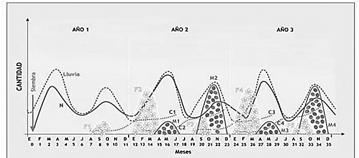 Según [13] para C. canephora y C. arabica L., es necesaria una fase seca para estimular la floración. Además, plantean que las precipitaciones abundantes son responsables de bajos rendimientos en la producción del café. Con base en esto y en los datos de precipitación presentados en la Fig. 1, se espera tener una menor floración después de los meses más lluviosos es decir durante los meses de agosto y noviembre. Después de un periodo seco y se debe presentar con las primeras lluvias entre los meses de enero y marzo.