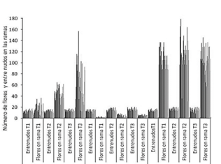 Sin embargo, en el mes de febrero del año (fin del estudio), se observó un mayor desarrollo de entre nudos en el tratamiento 2 con un valor de 18 entrenudos en promedio. Según [12], entre los meses de enero y abril hay una disminución del crecimiento vegetativo debido a que disminuye la disponibilidad de agua en el suelo para la planta y por tanto el ácido abscisico disminuye. Por el contrario, el desarrollo reproductivo empieza y los niveles de giberelinas aumentan.