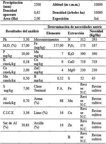 El análisis de suelos fue realizado en la Universidad Nacional de Colombia, sede Medellín. El suelo empleado en estudio presenta comportamiento ácido, lo cual es característico de los Andisoles de clima frio. El contenido de materia orgánica es bastante alto (17 %) debido a que la meteorización en las zonas altas es baja. El nivel de fósforo fue también alto, 20 65 mg/kg. Lo cual concuerda con lo reportado por Jaramillo (2002), indica que en este tipo de suelo se fija el fósforo. Los demás niveles de minerales están en promedios normales, a excepción del porcentaje de saturación de aluminio el cual fue es del 20%. Este suelo es Franco Arenoso con densidad aparente de 0,62 y con 65.7% de humedad gravimétrica. Adicionalmente, el resultado de la concentración de los cationes (K+, Ca+, Mg++), mostró que no están en balance; lo cual se verá reflejado en alteraciones o problemas durante las fertilizaciones.