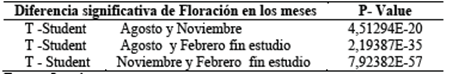 En la Tabla 4. Evaluación de la diferencia significativa de la floración evaluando mes y tratamiento. Se observa que no hubo diferencia significativa entre las floraciones de los tratamientos durante el mes de agosto, mientras que entre tratamientos y testigo si hubo diferencia significativa. De igual manera ocurre durante el mes de noviembre, donde no se encuentra diferencia significativa entre los tratamientos, pero si se encuentra con el testigo. Para finalizar se analizó la floración obtenida durante el mes de febrero y se encontró que no hubo diferencia significativa entre la floración de los arboles sin tratamiento y los arboles del tratamiento 3 (T3) -Aplicación foliar de ácido giberélico al 0,5%-. De la misma forma tampoco se encontró diferencia significativa entre los dos tratamientos. Es decir que factores como la baja precipitación y el estrés hídrico presentado por las plantas pudo presentar un efecto positivo en el desarrollo floral, lo anterior ocurre en consecuencia a lo enunciado por Moreno (2007) cuando define que los periodos de diferenciación y latencia están controlados por disponibilidad hídrica, hormonas y 72 nutrientes y que la florescencia o apertura de la flor está condicionada a un estrés hídrico previo a un periodo lluvioso.