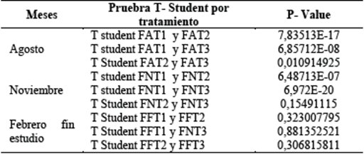 Los datos fueron sometidos a análisis estadístico mediante la prueba T- Student con probabilidad del 95% de nivel de significancia.