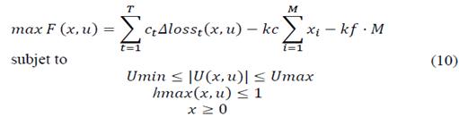 Where ct is the cost of losses in the load state t ($/kW) and ∆losst (x, u) is the saving of losses in the t load state due to the installation of capacitors with sizes x on the u locations. The annual cost of capacitors is represented by the units cost kc($/kvar), and the fixed cost per capacitor bank kf ($/bank). Besides, M is the number of capacitors.