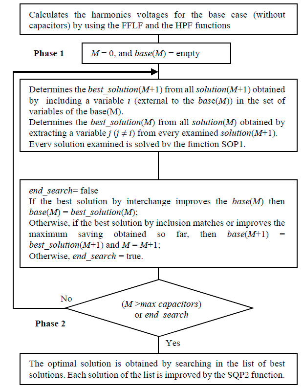 The search algorithm begins from the empty solution base(0) (number of capacitors M = 0). The solution grows in number of variables (capacitors) from the base(0) solution up to the solution with the maximum Fp(x). In each step, departing from the base(M) of M capacitors, a new solution is obtained by adding a new variable (location) to the base(M) or by interchanging a variable of the base(M) solution with a variable external to this solution. This algorithm is described by the Flowchart 1.