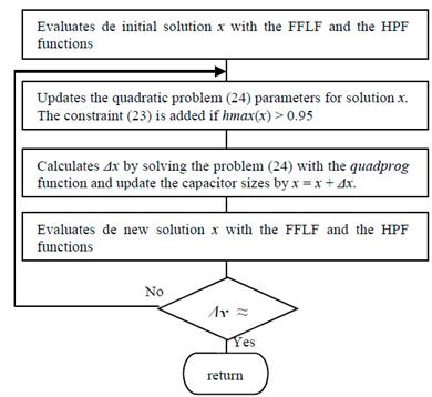 The SQP method solves the problem (10) by the successive determination of the best feasible variation Δx that solves the quadratic sub-problem (24). The first iteration begins with x = 0 (without capacitors) and next iterations increase x by x + Δx. Only a few iterations are needed to obtain convergence of x.