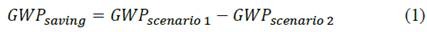 Global warming potential algorithm for the proposal to manufacture packaging based on fruit residues under the circular economy model, eq. (1)-(6).
