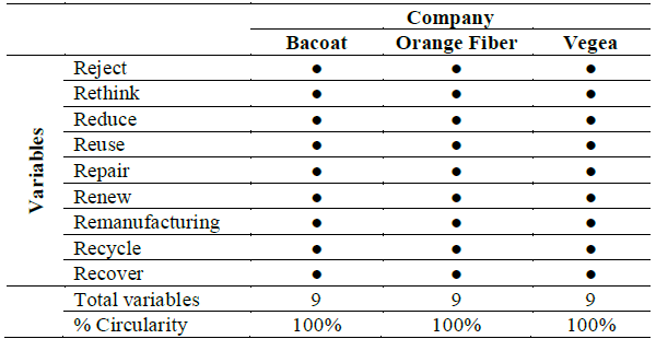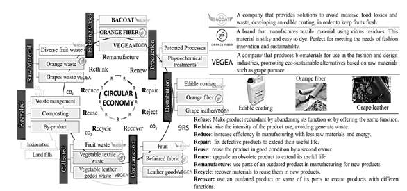 Through the case study tools, the characterization of 3 companies related to fruit residues that promote their processes under the circular economy model in the manufacture of products through the triangulation methodology was carried out. The study companies were Bacoat, Orange Fiber, and Vegea, which were selected according to a qualitative 9R evaluation proposed by the researcher. On the basis of this, the circular economy model of each of the companies was outlined since it did not exist.