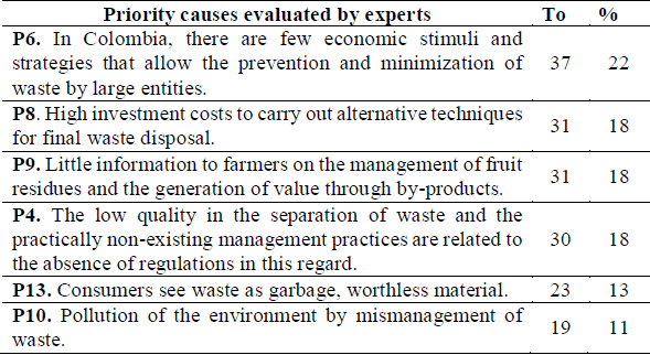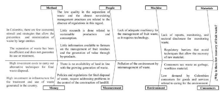 The main causes that produce low recovery of fruit residues throughout the supply chain were identified through secondary sources of information. Due to their impact, the following main reasons stand out: the country does not provide economic incentives or strategies that allow waste to be minimized, investment costs to carry out alternative techniques for the final disposal of waste are high, there is little research related to processes and sustainable consumption, and finally there is not a well-established culture of correct waste management by consumers. In the same way, the previous causes were prioritized.
