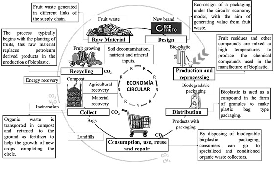 The bioplastics industry is gaining momentum. It is estimated that the industry of these bio-based plastics currently represents 0.2% of the 350 million tons that are consumed each year in the world, but that volume can be mitigated, thanks to the growing demand for ecological packaging and other products that use biomass as raw material. Therefore, the circular economy model focused on the production of packaging based on fruit residues allows to fulfill the offer and achieve benefits by mitigating the negative effects mentioned throughout this article. The final result is then proposing a model that contained the studied variables and functions of triangulation, aiming at a solution focused on costs and the reduction of the carbon footprint.