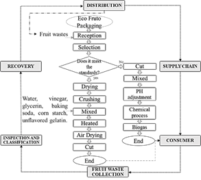 The manufacture of packaging is exposed below where its main raw material is the fruit waste generated throughout the supply chain, applying the circular model in its production processes, as seen in Fig. 3.