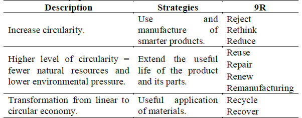 In this process, the variables established must be evaluated in relation to the 9R strategies, which allow the increase of circularity with respect to the characterization carried out previously, as seen in Table 1.