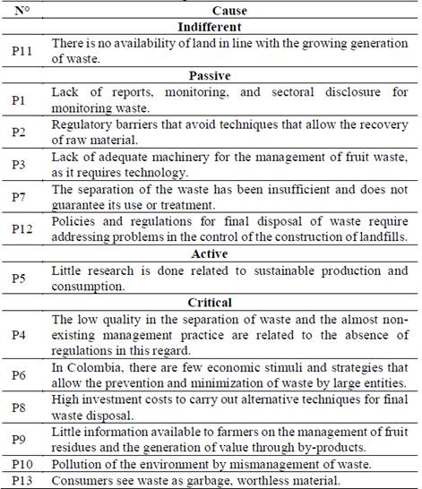 Through the application of the following analysis matrix, each cause is related to its level of incidence. 13 important causes are identified that include deficiencies in the recovery of the value of fruit residues, highlighting the different general aspects as seen in Table 3. These causes were classified with respect to the percentages presented below: 7% indifferent, 31% passive, 8% active and 54% critical.