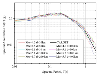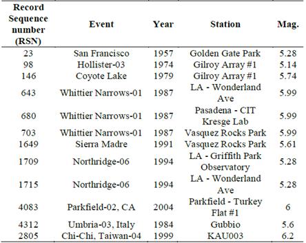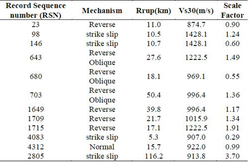 The search results are shown in Table 2, 3, a total of twelve records were found. The response spectra of the scaled ground motions are presented in Fig. 4 including the geometric mean of the results. The process of searching and scaling the accelerograms returned a series of results that on average are compatible with the target response spectrum.