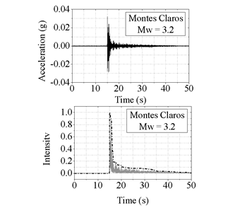 Figs. 12 and 13 present the acceleration time-histories and the associated envelope shapes of the recorded motions. It can be observed that low accelerations were recorded from the São Vicente earthquake, this is due to the distance between the station and the epicenter (around 313.8 km). The Montes Claros earthquake, on the other hand, was recorded by a station located at 1.44 km of the epicenter, then, relatively higher accelerations can be observed.